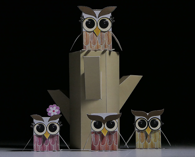 Une adorable famille de hiboux en trois dimensions. Ils sont faits de carton de qualité supérieur avec des couleurs vives et amusantes. Ils sont complémentaires à la capsule « Le hibou et son arbre ».
