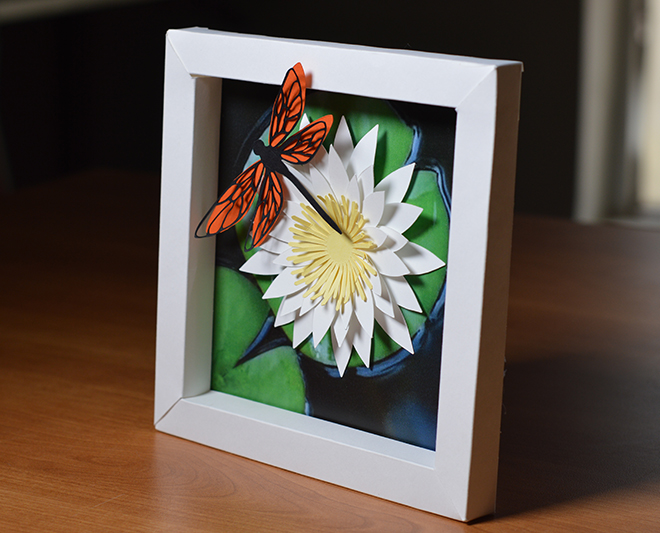 Un joli cadre sur la thématique de la nature en trois dimensions illustrant une libellule posée sur une fleur avec un fond de nénuphar. Une fois assemblé, le cadre mesure 6,10 pouces de haut, 6,10 pouces de large et 0,66 pouce de profondeur.