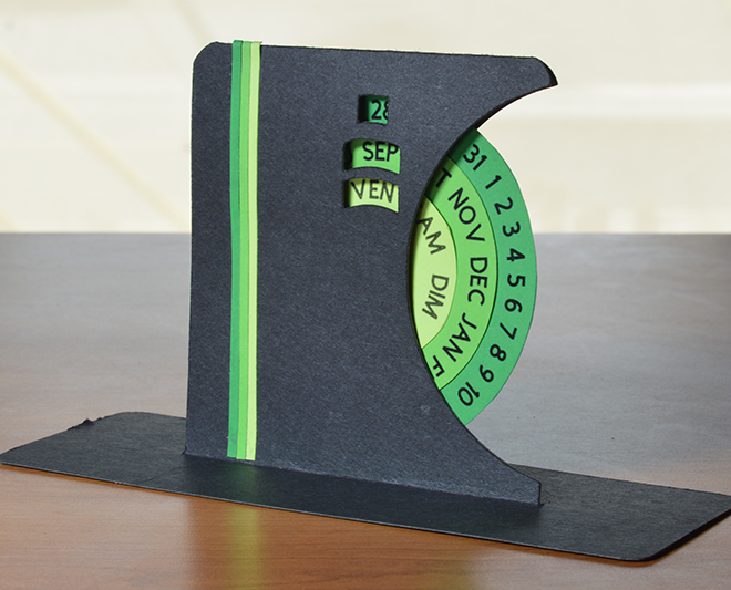 Une fois assemblé, le calendrier mesure 4,5 pouces de haut, 2,75 pouces de largeur sur 7,5 pouces de longueur.